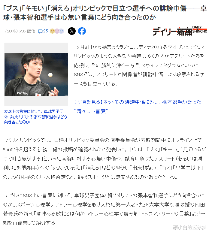 日本媒体《DALY SHINCHO》近期对张本智和受到的网暴撰写了长文,标题为丑八怪、恶心、退役吧,对奥运选手的诽谤中伤,乒乓球选手张本智和该如何面对网暴言论?